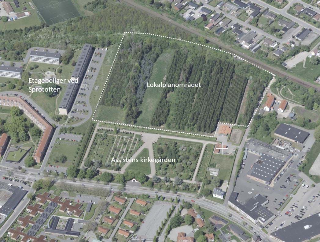 På skråfotoet kan man se lokalplanområdet og sammenhængen med kirkegården og etageboligerne mod vest.