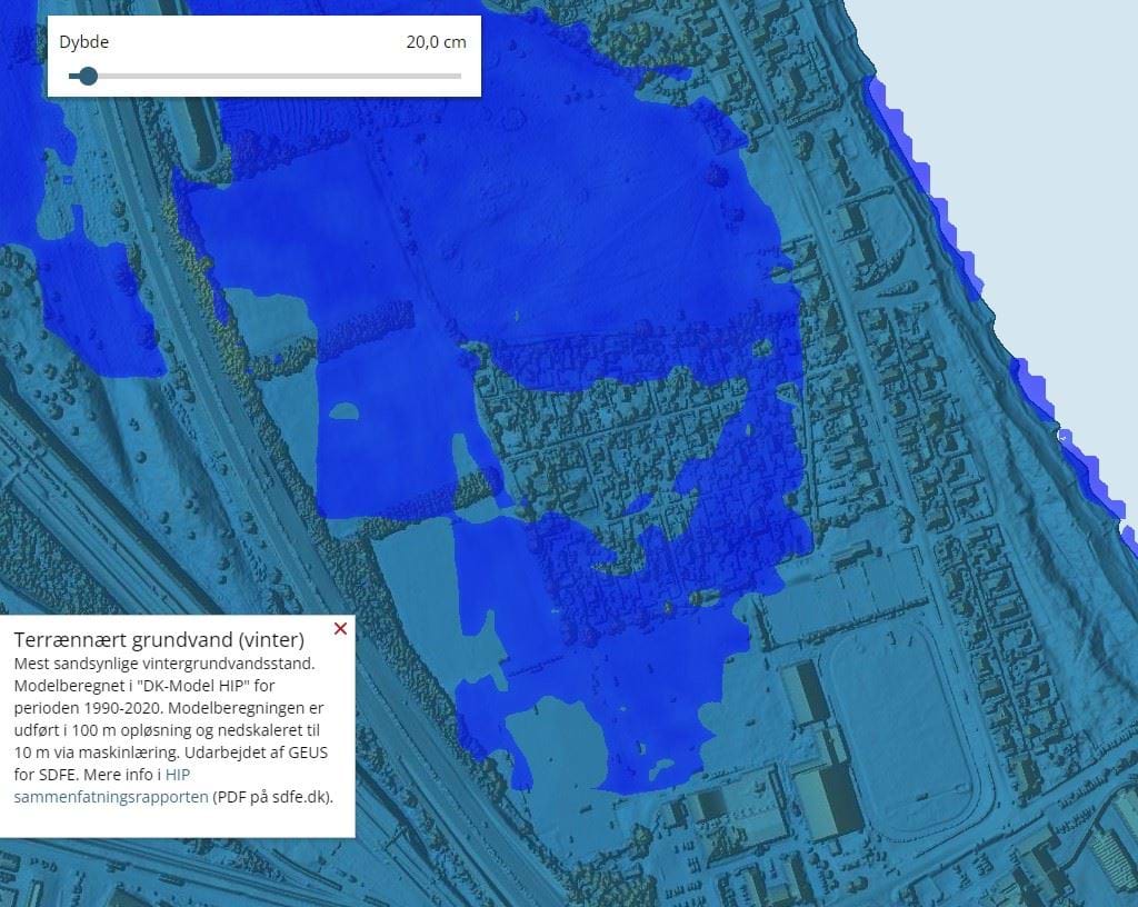 Terrænnært grundvand ca. 20 cm under terræn (vinter) i området ved Elefanthøjen. Kilde: SCALGO Live.