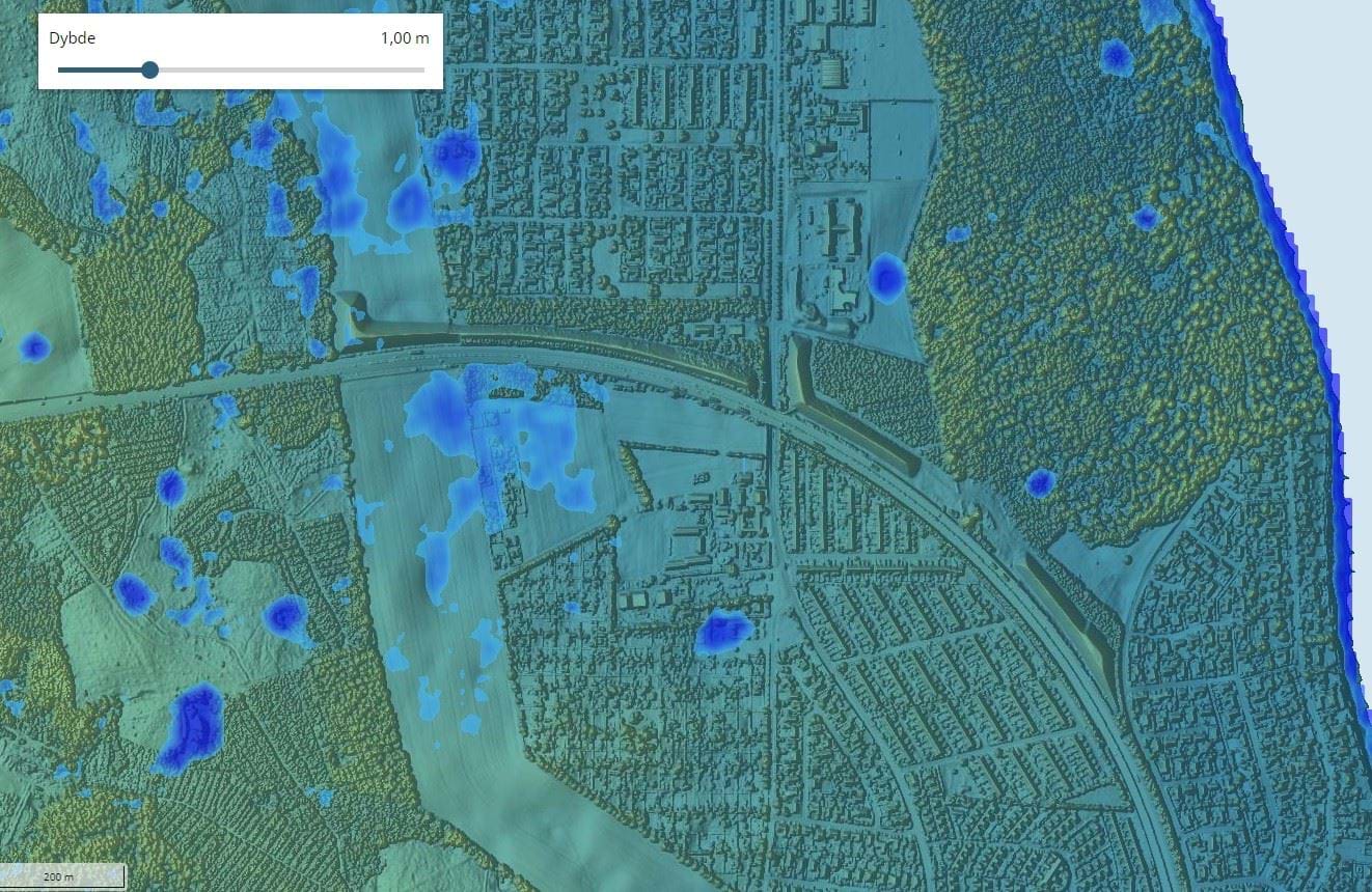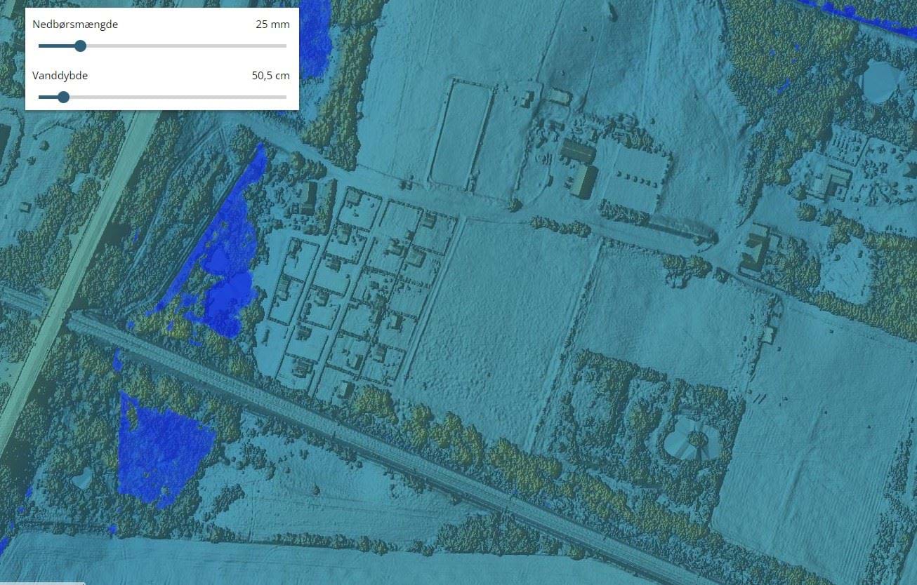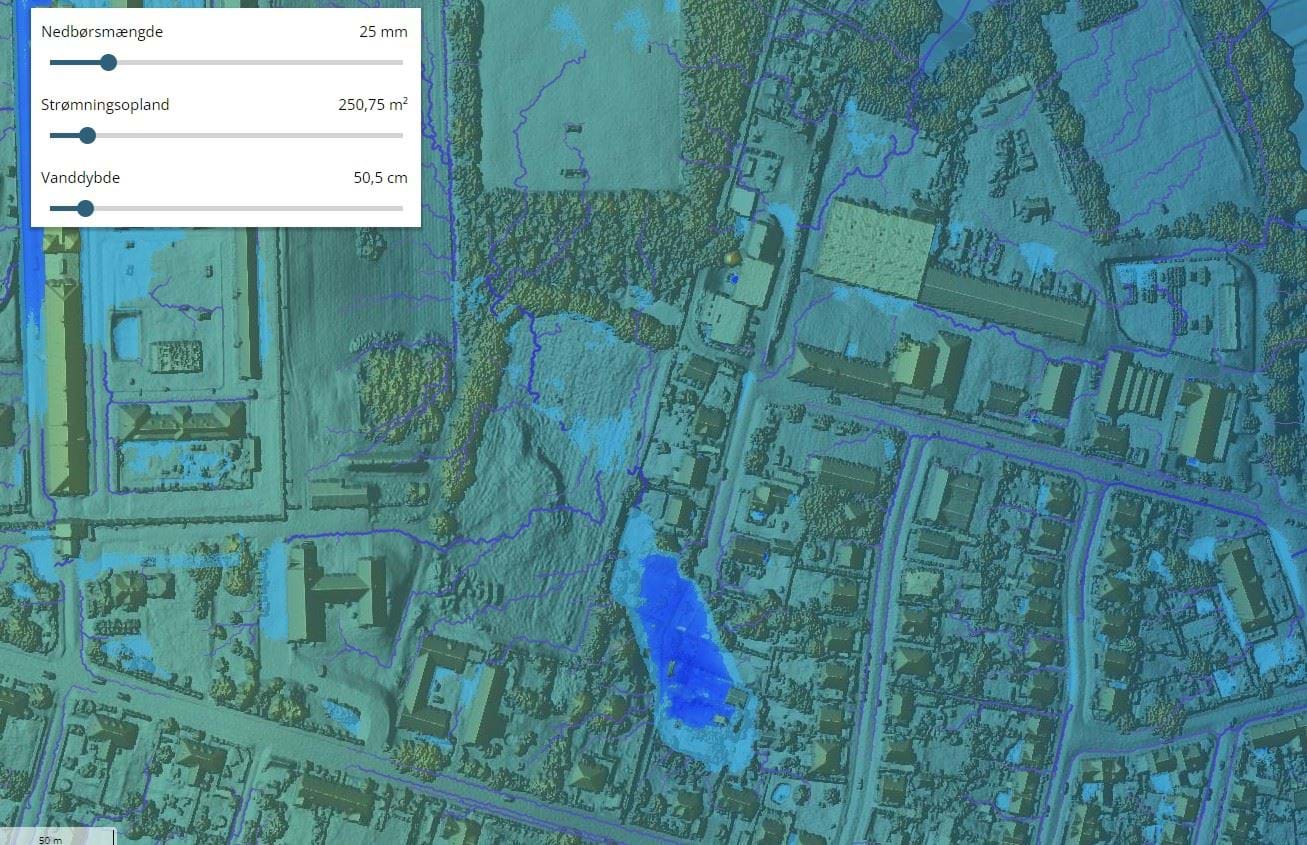 Skybrudskort. Ved nedbør på 25 mm kan der stå ca. 50 cm vand på terræn. Kilde: SCALGO Live.