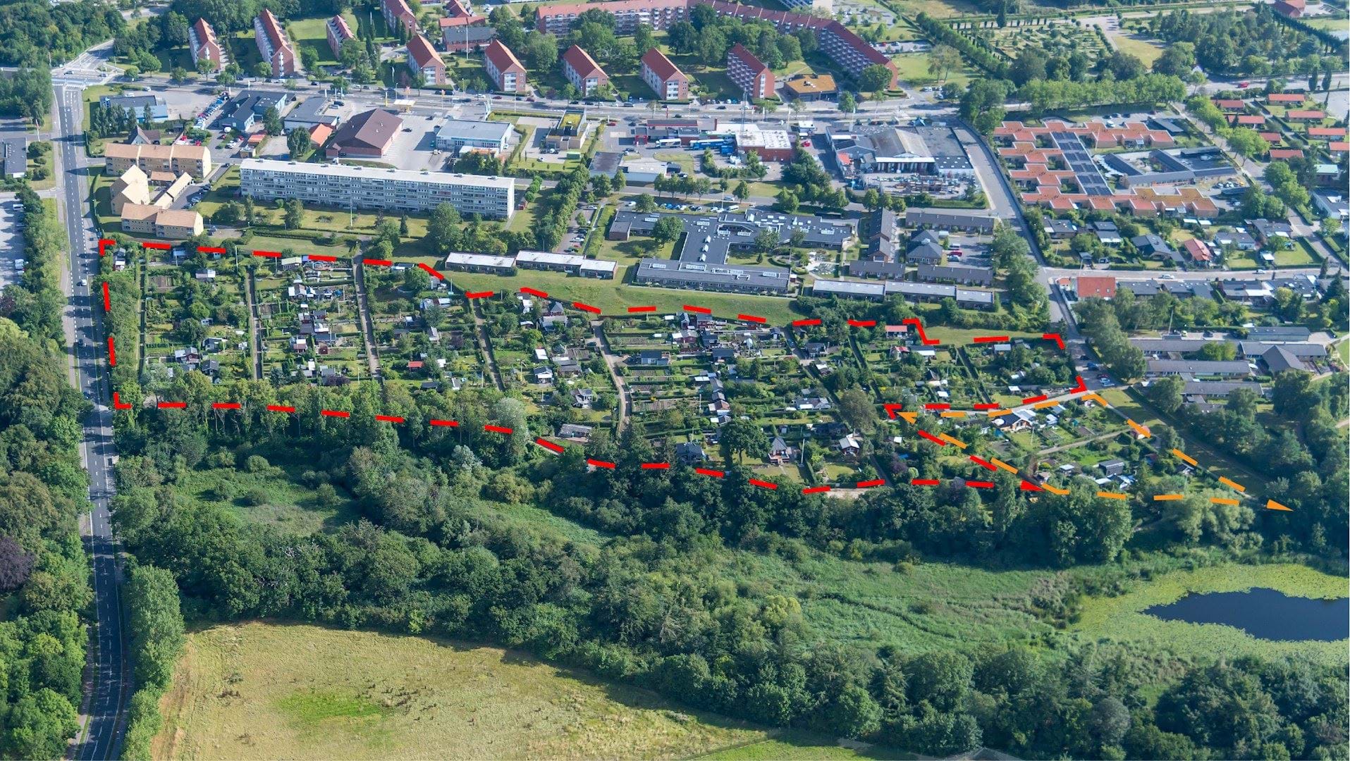 Luftfoto fra 2019 af Kolonihaverne Hf. Helgetoften og Hf. Grejsdalen ved Ladegårdssøen med boligetagebyggeriet i Helgetoften og Sprotoften i baggrunden.