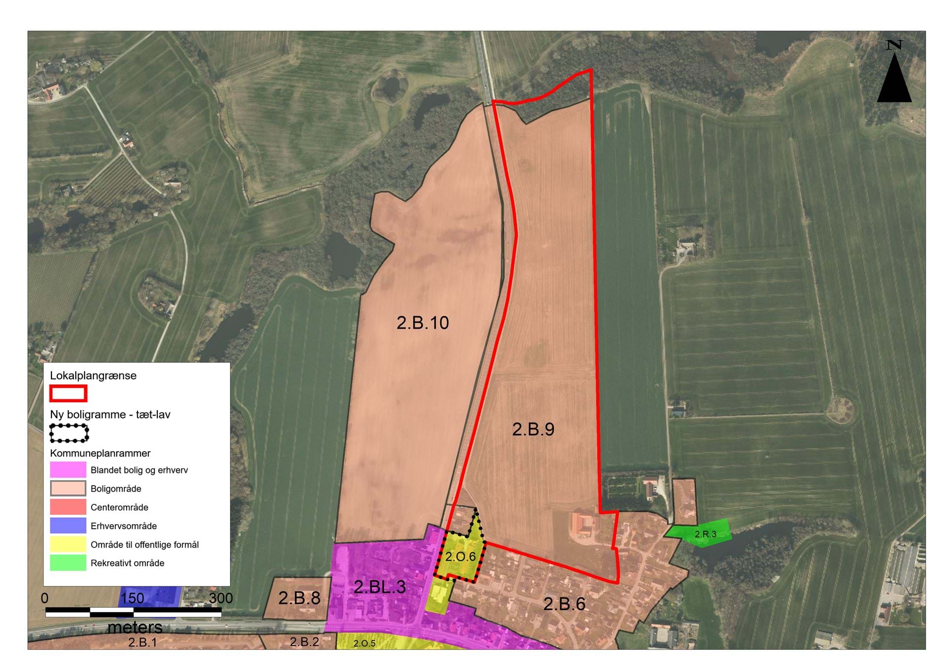 Rammeområde 2.B.9 omfatter et område, der er i landzone, men som er planlagt til byudvikling. Rammen udlægger området til boligformål i form af åben- og tæt-lav boliger. Bebyggelsesomfanget er fastsat til: Bebyggelsesprocent 30 for åben-lav og 40 for tæt-lav (storparceller), max. højde 8,5 m og max. etageantal 2. Rammen fastsætter endvidere følgenede bestemmelser: