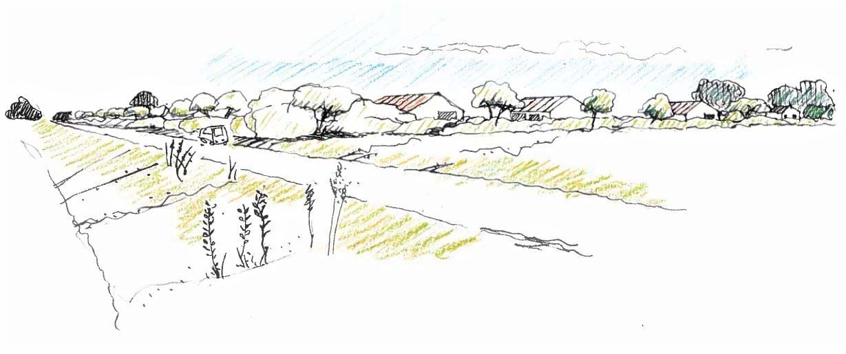 Figur 13: Boligområdet set fra landskabet øst for planområdet. Det beskyttede dige er med til at sløre byens kant mod det åbne land og skabe en fin arrondering af området.