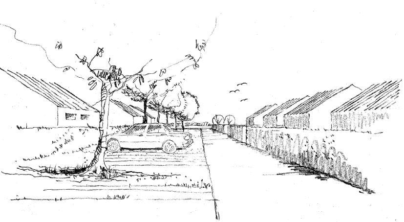 Figur 9: En boligvej i det nye boligområde. Boligernes facader ligger i en ensartet afstand fra boligvejen og skaber på den måde et intimt og imødekommende boligområde.