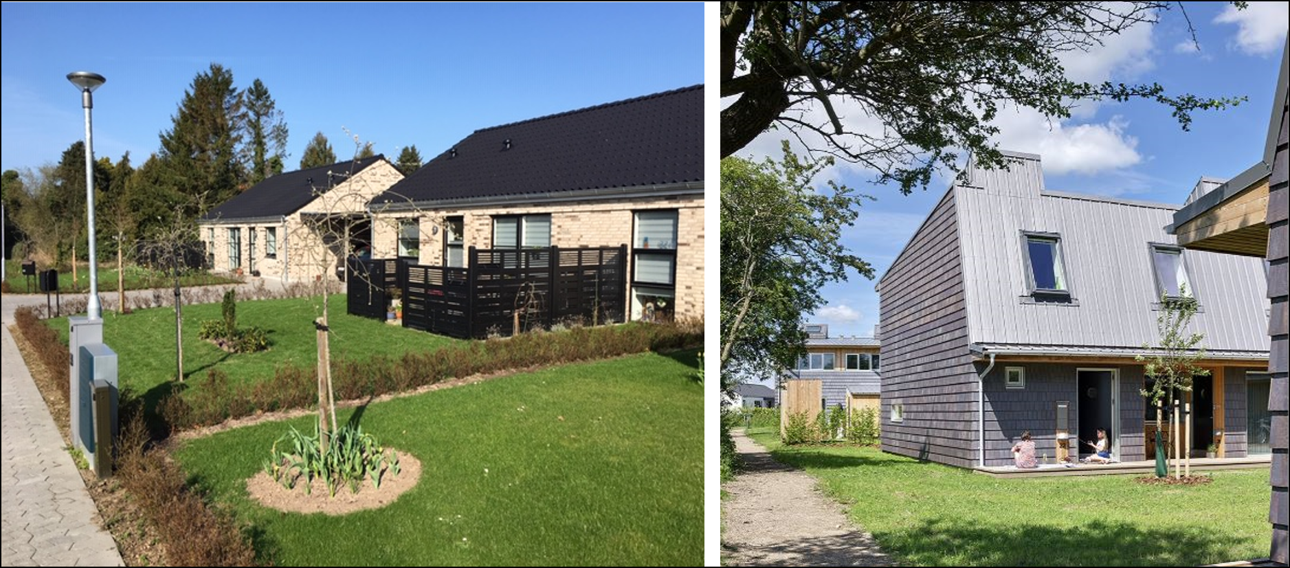 Figur 14: To typer af rækkehuse, som eksempler på, hvad der kan bygges i området. Til venstre et klassisk rækkehus i teglsten og til højre et mere moderne rækkehus i træ.
