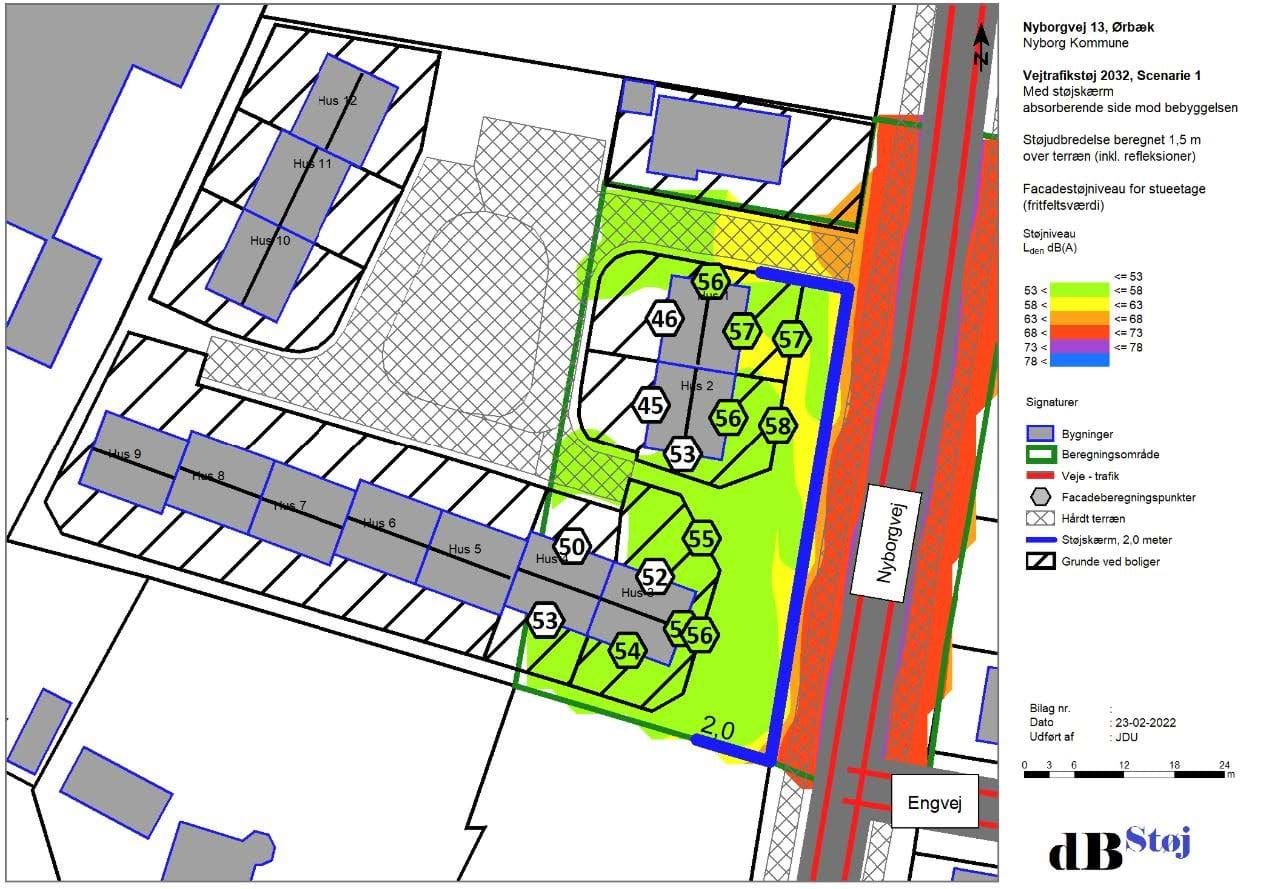 Det ses også, at det for scenarie 2 med en 2 meter høj støjskærm i 15 meters afstand fra Nyborgvej vil være muligt at overholde grænseværdien på 58 dB Lden ved både bygningsfacader samt i skelpunkter ved terræn.