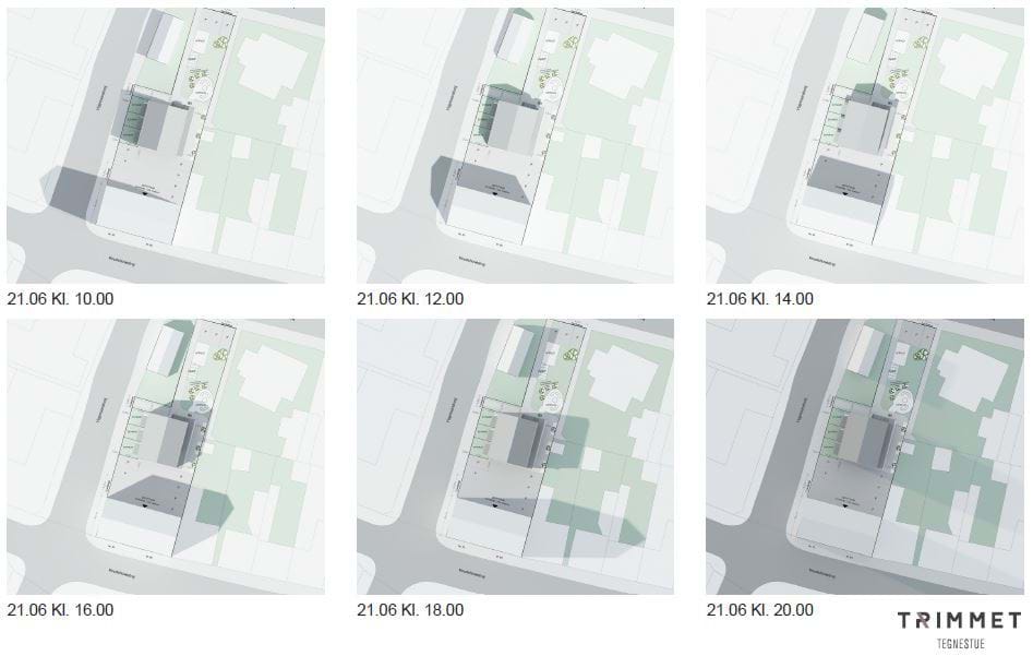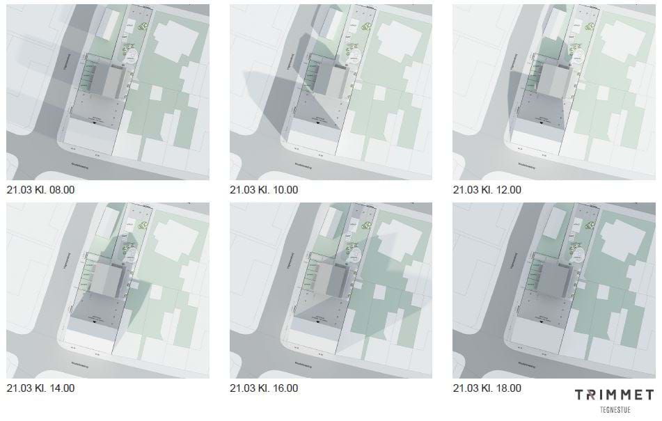 Diagrammet viser dels, at den eksisterende etageboligbygning kun i begrænsede perioder vil skygge for altaner og byhaver i den planlagte bygning. Dels, at den planlagte bygning vil give skyggevirkninger i haver øst for planområdet efter kl. 16 forår/efterår og hovedsageligt efter kl. 20 i sommerperioden. Den illustrerede skyggevirkning på nordøstlig nabo om eftermiddagen i december skyldes i væsentlig grad den eksisterende etagebygning.