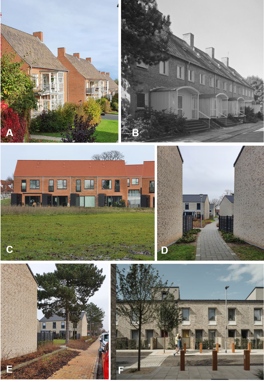 Figur 6: Referencebilleder for de nye boliger i området: A) Solbakken, Aarhus. B) Hesseltoften, Hellerup. C) Skt. Jørgens Engen, Odense. D og E) Østerlunden, Odense. F) Goldsmith Street, Norwich, England.