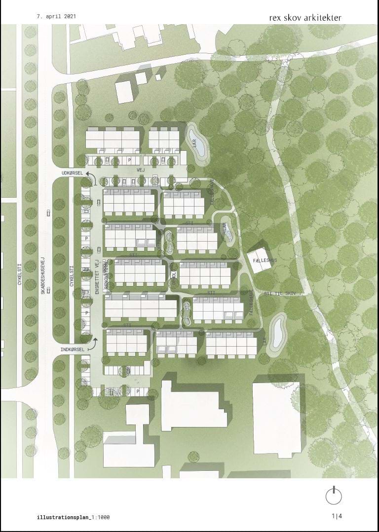 Figur 12: Illustration af en mulig indretning af området baseret på planens bestemmelser. Vej- og parkeringsarealer placeres tættest ved Skaboeshusevej og boligbebyggelsen samles som en tæt enklave af byhuse arrangeret omkring et internt stisystem. Langs stisystemet laves områder til opholds, nedsivning af regnvand og der sættes træer. Mellem bebyggelsen og skoven sikres et 25 m bredt grønt bælte, hvor der kan laves et fælleshus og aktivitetsområder, men som derudover skal friholdes for bebyggelse.