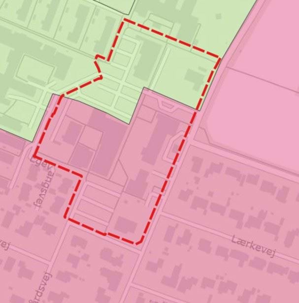 Kortet viser lokalplanområdet i forhold til spildevandsplan 2018-24. Det grønne område er separatkloakeret område, mens det røde område er fælleskloakeret område.