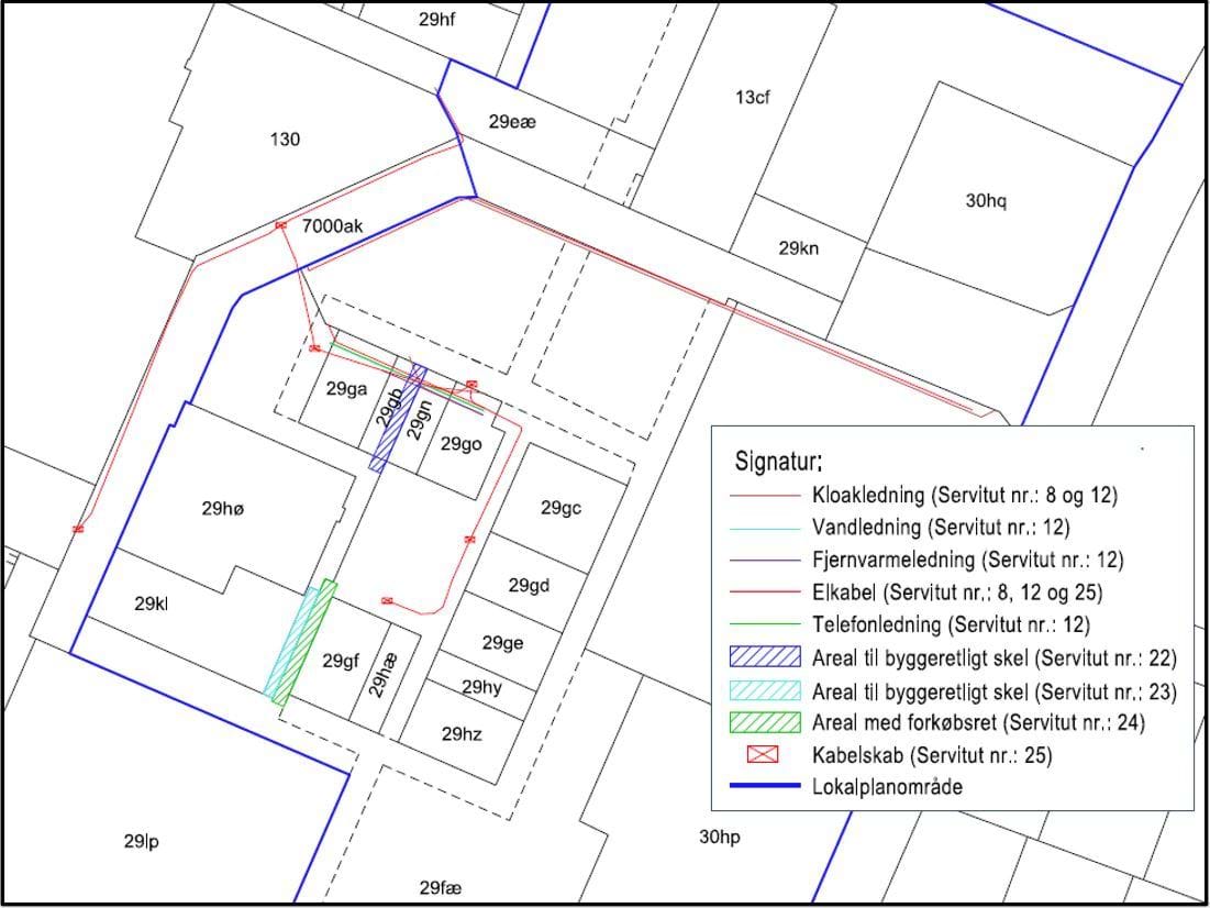 Kortet stedfæster servitutter indenfor lokalplanområdet, som kan have betydning for bygge- og anlægsarbejder.