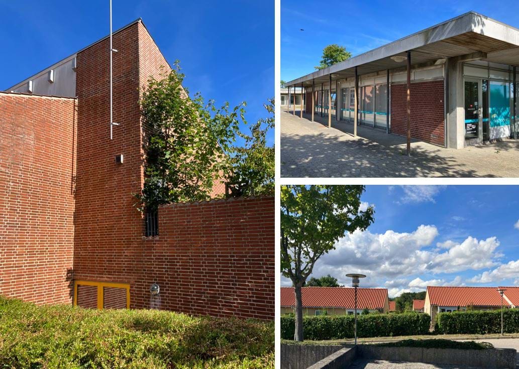 Det bebyggede miljø i og omkring centeret er kendetegnet ved forholdsvis lave bebyggelser i 1 og 1½ etage. Herudover er tegl et gennemgående materiale. Billederne er af hhv. det tidligere rådhus (nu daginstitution), centerbebyggelsen og rækkehusboliger vest for lokalplanområdet.