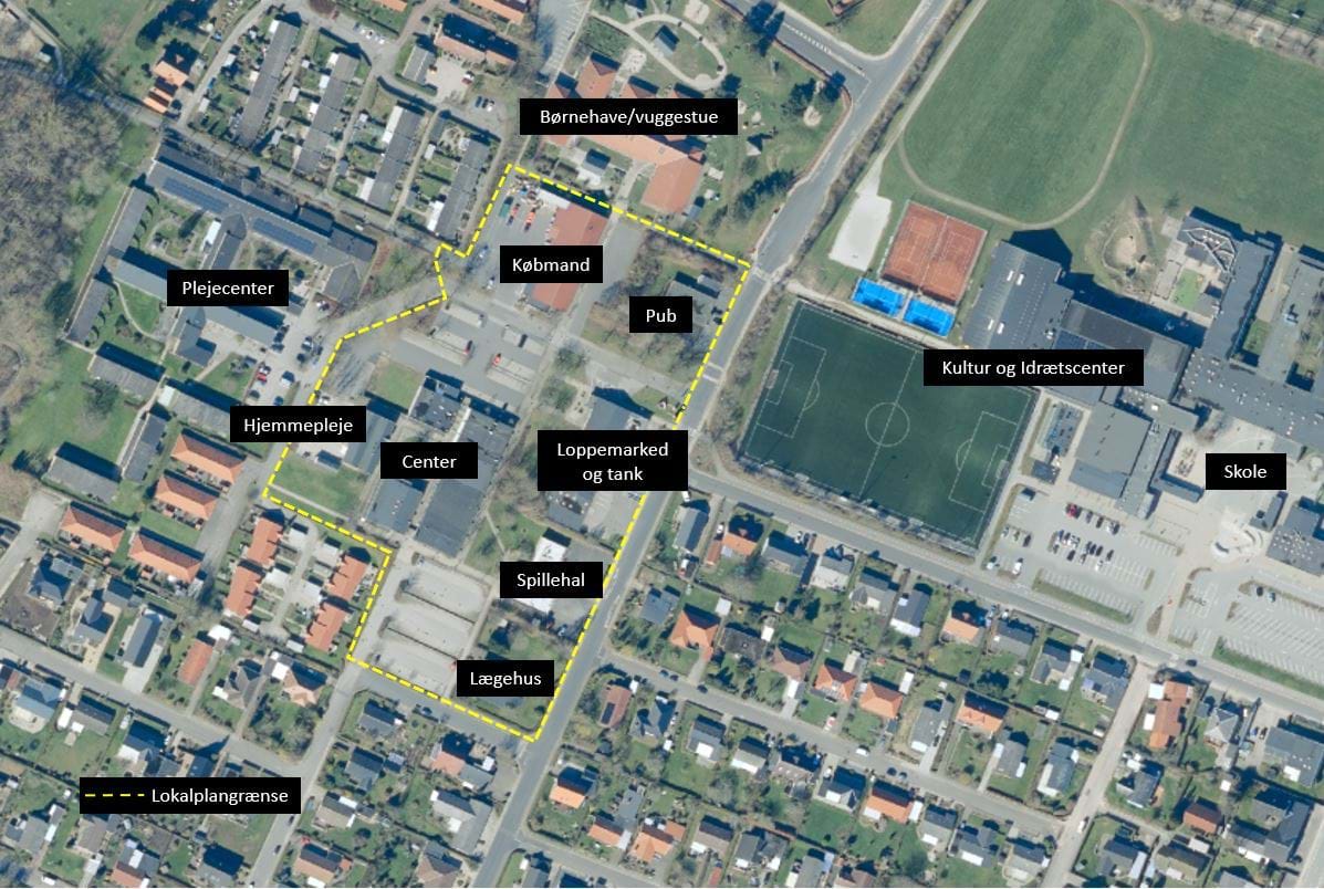 Kort som viser lokalplanens afgrænsning og nærmeste omgivelser med blandt andet plejecenter, børnehave og kultur- og idrætscenter.