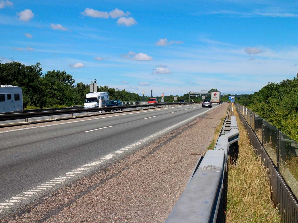 Kig til pylonerne fra motorvej E20 i østgående retning. Den planlagte pylon står umiddelbart til venstre for den eksisterende pylon ved OK tanken. Motorvejens krumning betyder, at pylonen kun kortvarigt vil blokere udsigten til den eksisterende pylon.
