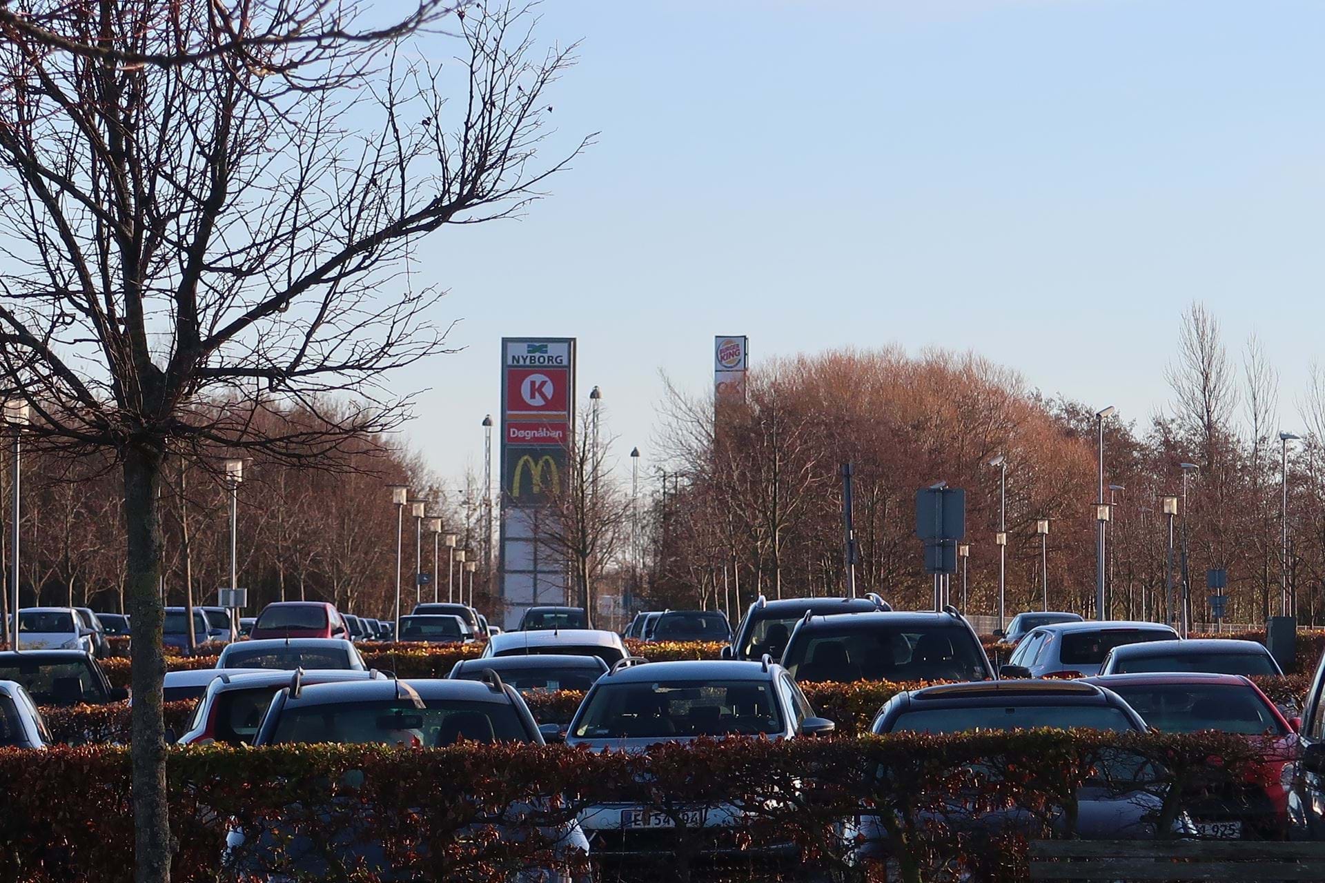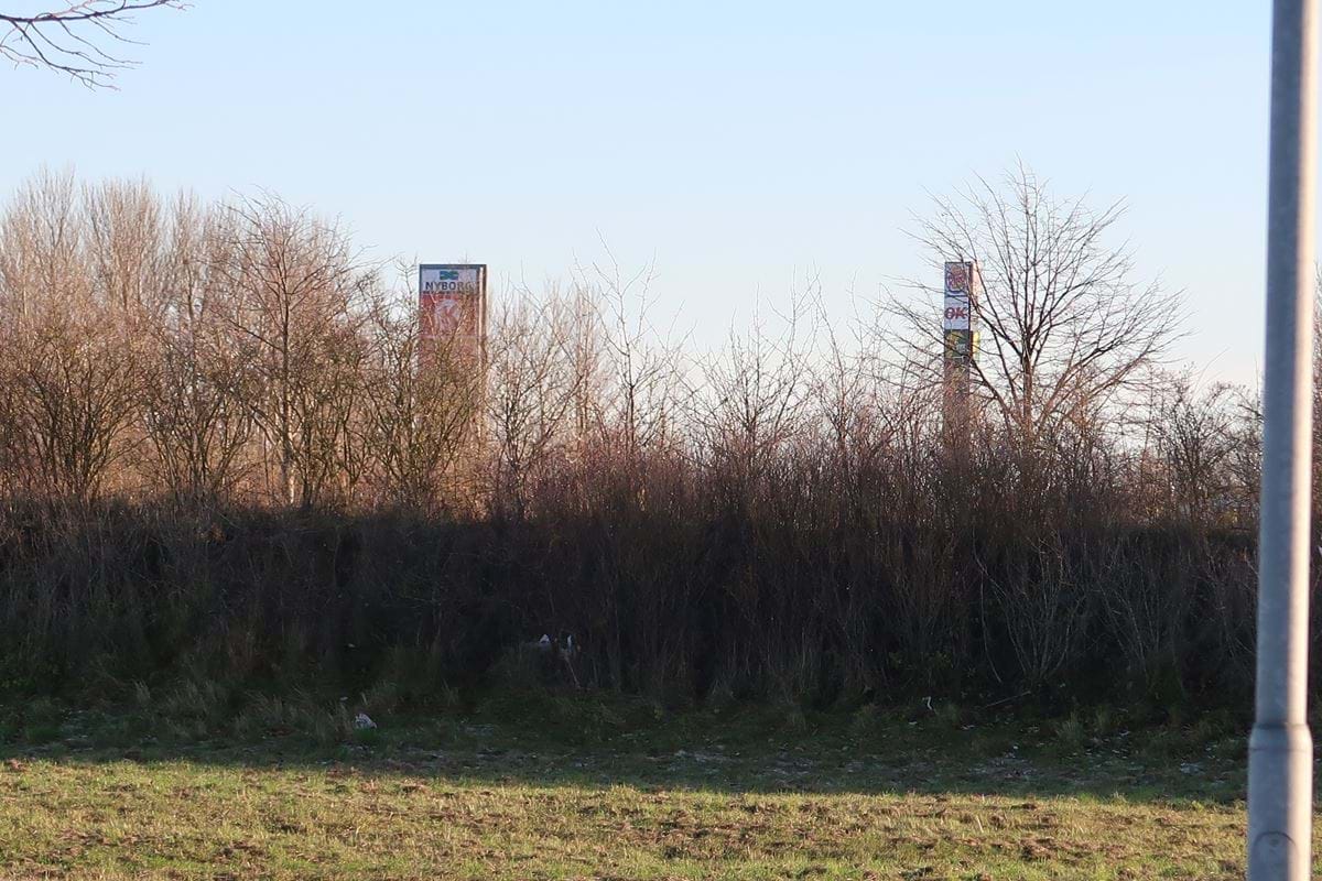 Kig til pylonerne fra motorvej E20 i vestgående retning. Den planlagte pylon står til højre for den eksisterende pylon ved OK tanken.