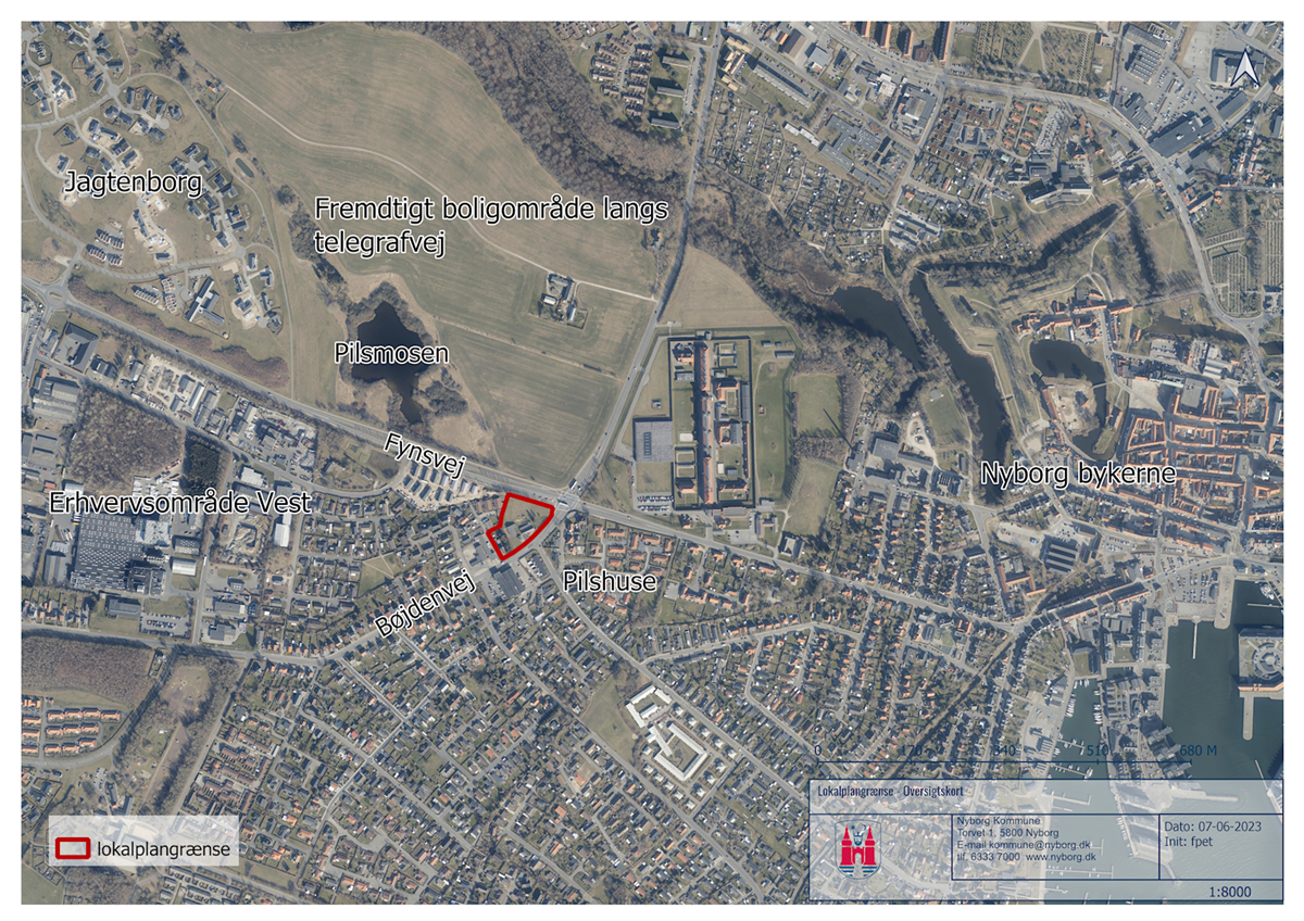 Figur 1: Oversigtskort med placeringen af lokalplanområdet i den vestlige del af Nyborg. Planområdet ligger øst for byens største erhvervsområde, men er omgivet af eksisterende boliger
