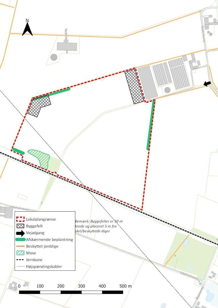 Kortbilag to viser byggefelter, vejadgang, placering af afskærmende beplantning, beskyttede jorddiger, mose, jernbane og højspændingsledninger.