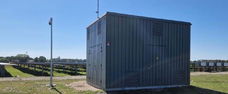 Billedet viser et eksempel på en transformerstation. I baggrunden ses solceller med trackersystem.
