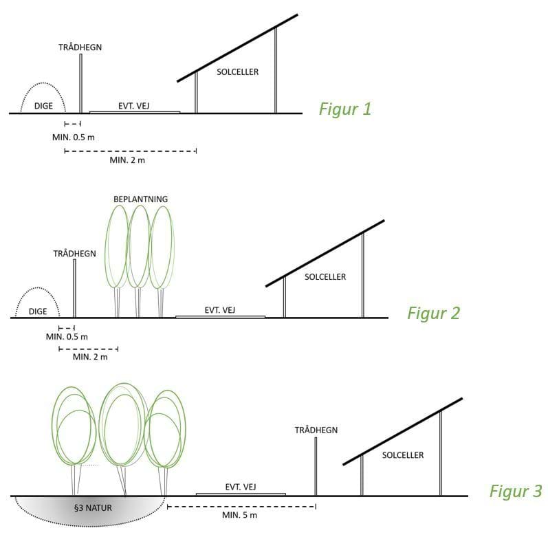Lokalplanen fastlægger bestemmelser om, at solcelleanlægget som helhed inkl. beplantning ikke må placeres nærmere de omkransende beskyttede diger end 2 m og ikke nærmere det §3 beskyttede naturareal end 5 m. Trådhegn kan dog placeres tættere på de beskyttede diger (indtil 0,5 m), men skal ligeledes respektere en afstand af 5 m fra det §3 beskyttede naturareal.