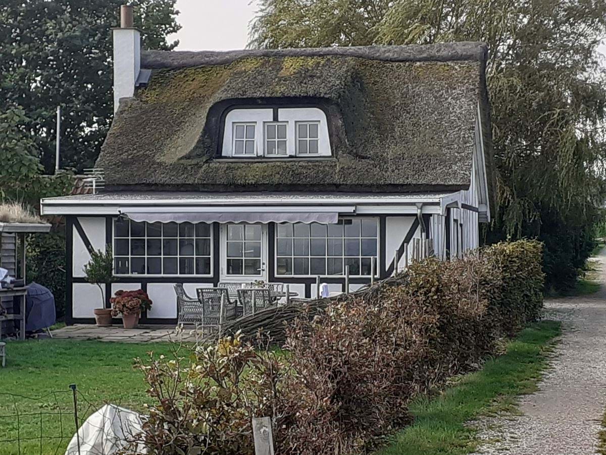 Et af de nyere sommerhuse, hoved huset er lavet med stråtag, og sidebygningen som kan skimtes i baggrunden med grønt tag.