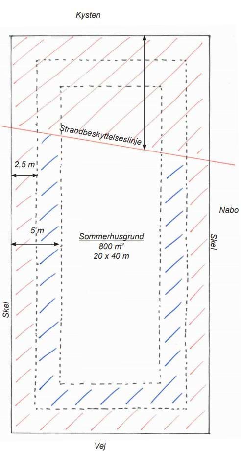 Figur, nedenstående: Illustration af byggelinjer på en eksempelgrund på 800 m2 (20 x 40 meter). Alle bygninger skal som udgangspunkt placeres 5 meter fra skel og der må endvidere ikke placeres bebyggelse søværts strandbeskyttelseslinjen. I bræmmen 2,5-5 meter fra skel (markeret med blå skravering) kan nogle former for bebyggelse dog tillades under visse forudsætninger.