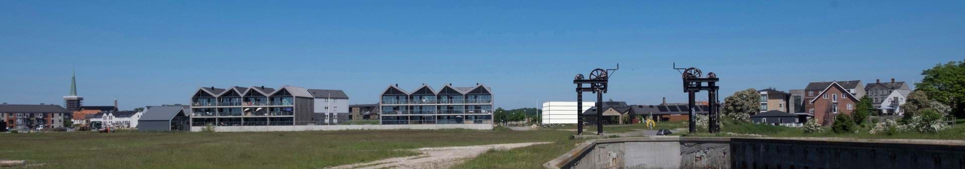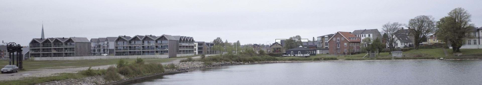 Figur 12: Fra vandet kan en ny bebyggelse næsten ikke ses idet Nyborg Destilleri ligger foran bebyggelsen set fra vandet. Billedet er taget ca. 250 m fra kysten.