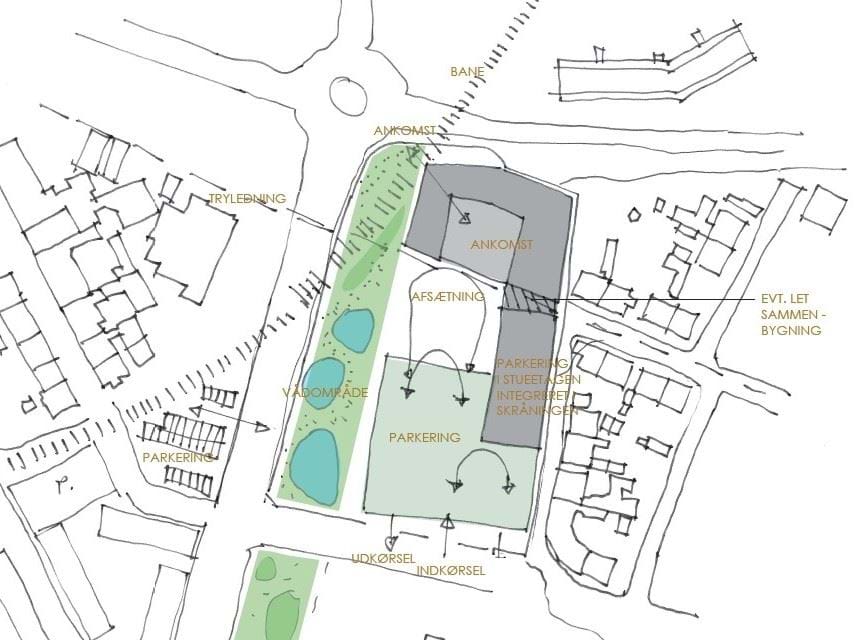 Figur 7: Illustration af, hvordan en bebyggelse efter lokalplanens bestemmelser kan placeres på grunden. Bemærk, at det er lokalplanens bestemmelser, der sætter rammerne for et fremtidigt byggeri, hvorfor resultatet kan se anderledes ud end vist på eksemplet.