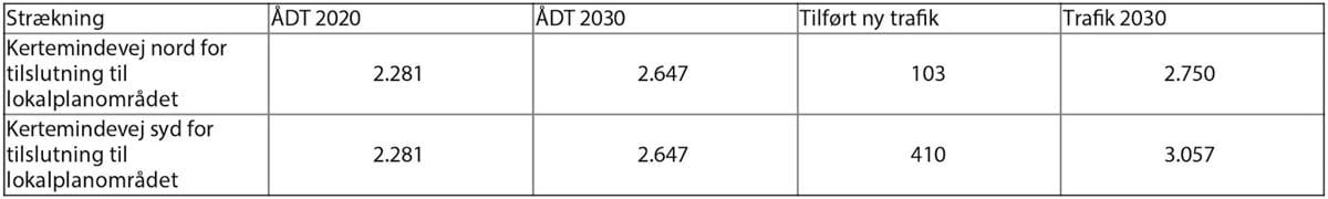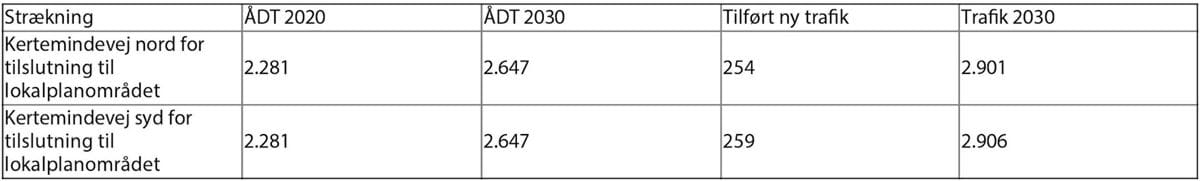 Tabel: Trafiktal (ÅDT), talt eller fremskrevet for de enkelte strækninger på Kertemindevej. Retningsfordeling 20/80.