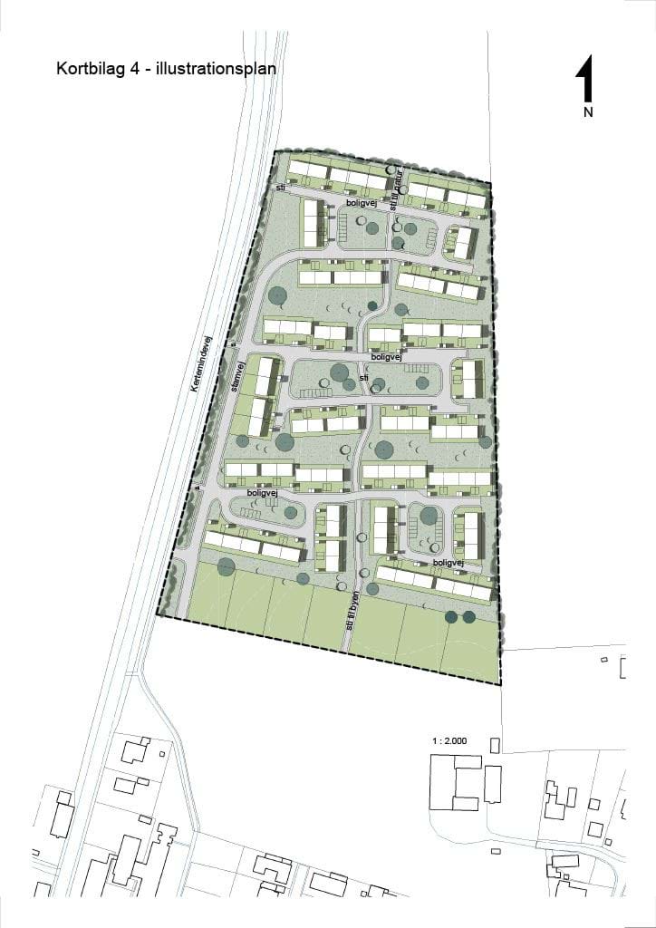 Figur 7: Illustrationsplan for byudviklingens til boligformål nord for Ullerslev, i forlængelse af de udlagte parcelhusgrunde lige syd for planområdet.