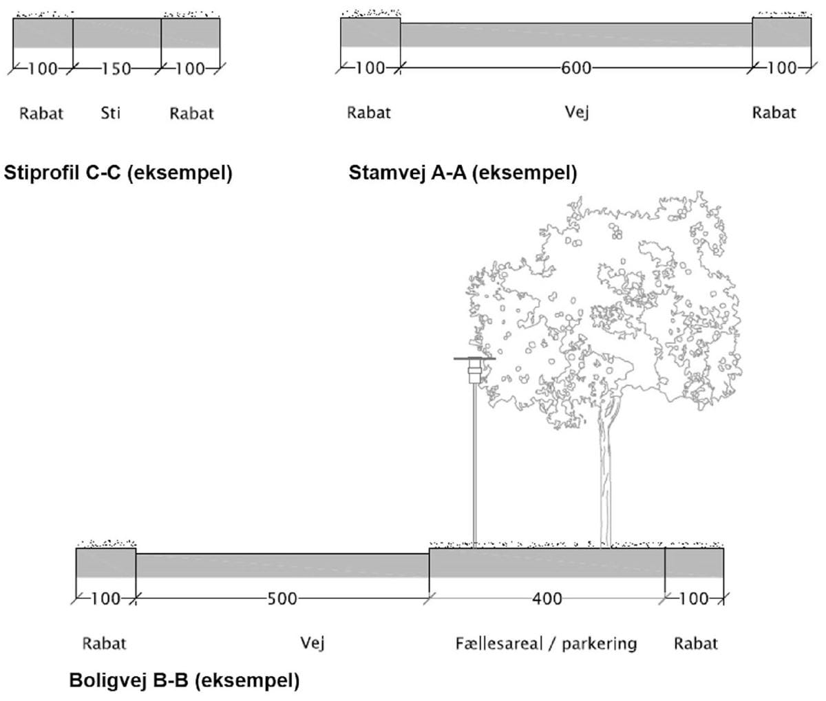 Figur 5: Eksempel på profiler for hhv. stiudlæg, stamvejen og boligvejene. Planen fastsætter at kørebanebredden for